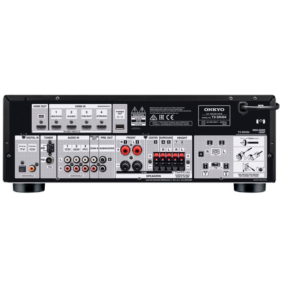 TX-SR494 раскрывает перед вами радости повседневной жизни благодаря великолепному звуку и интеллектуальным функциям – начиная от легкости беспроводного стриминга через Bluetooth - и до пробирающих до самого сердца звуковых дорожек в форматах Dolby Atmos и DTS:X. Семь мощных каналов с большими выходными токами дают вам свободу выбора необходимого комплекта колонок. TX-SR494 поднимает на новую высоту ваши впечатления от Dolby Atmos и DTS:X. Объектно-ориентированное аудио микшируется в трехмерном пространстве и позволяет воспроизводить любые звуки через любые колонки в вашей системе, отслеживая действия, локализуя эффекты и перемещая их вокруг вас. Dolby Surround и DTS Neural:X дополняют исходное 3D воспроизведение аудио. Это технологии находят указания на локализацию объектов в старых стерео или многоканальных саундтреках и дополнительно микшируют их для создания третьего измерения – сверху и донизу. Во время воспроизведения любого формата Dolby, включение виртуализатора Dolby Atmos Height Virtualizer обеспечивает более полное погружение за счет создания виртуального окружения и эффекта высоты от традиционных комплектов колонок, без использования дополнительной тыловой или потолочной акустики. Примечание: Активируется только после обновления прошивки ПО в будущем. DTS Virtual:X – это новая технология виртуализации окружающего звука, которая создает трехмерное (3D) звуковое поле с помощью любого комплекта колонок, такого, например, как 2.1, 3.1, и 5.1, без установки реальных верхних, боковых или тыловых акустических систем. Она использует хитроумные алгоритмы DSP-процессора для того, чтобы поместить аудиторию в центр многомерного звукового поля, с ощущением высоты и окружения, и одинаково эффективна как в больших, так и в малых помещениях. DTS Virtual:X работает в 3D области со звуковыми дорожками в DTS:X, DTS форматах, а также с обычными стерео записями. Наслаждайтесь всесторонней поддержкой видео форматов 4K/60p и HDR (High Dynamic Range - с широким динамическим диапазоном), включая HDR10, HLG, Dolby Vision и BT.2020. Цветовое пространство 4:4:4 также поддерживается. Все 4 входа HDMI и готовый к сигналам ARC выход пропускают видео от плеера к вашему совместимому TV, открывая все, что могут вам предложить самые последние фильмы и игры. Вы можете легко подтвердить состояние A/V входов/выходов в новом окне экранного меню OSD. Интересно увидеть мощность в ваттах, как самый важный параметр в характеристиках усилителя. Тем не менее, ватты являются показателем громкости, а не качества звука. Амперы – величина электрического тока – вот, что расскажет вам реальную историю. Чем больший ток может выдать усилитель, тем лучше он управляет колонками. Чем лучше контроль, тем быстрее переходная реакция, шире динамический диапазон, и яснее, точнее звук. Крупный трансформатор, конденсаторы большой емкости и усилители на дискретных элементах внутри TX-SR494 выдают самый большой ток в своем классе. И это одна из главных причин, почему TX-SR494 звучит так хорошо. AccuEQ позволяет задать расстояния до колонок, уровни громкости и частоты кроссовера. Кроме того, AccuEQ Advance использует измерения в нескольких точках для подавления в комнате стоячих волн, обычно ухудшающих басовый отклик и качество звучания. Эта технология обнаруживает и компенсирует также фоновые шумы, такие как от системы кондиционирования воздуха, чтобы повысить точность эквализации. TX-SR494 оснащ