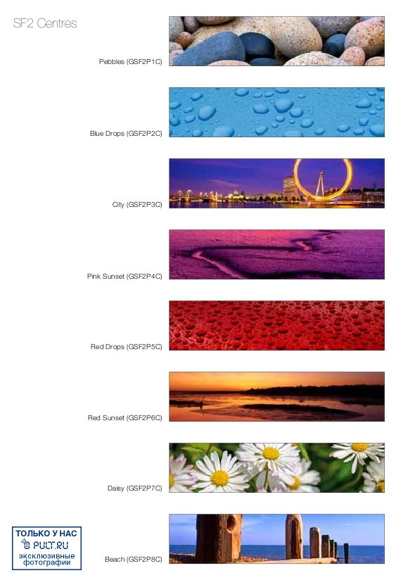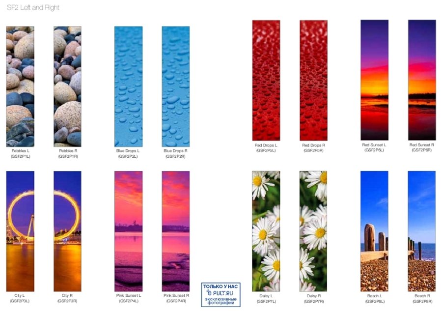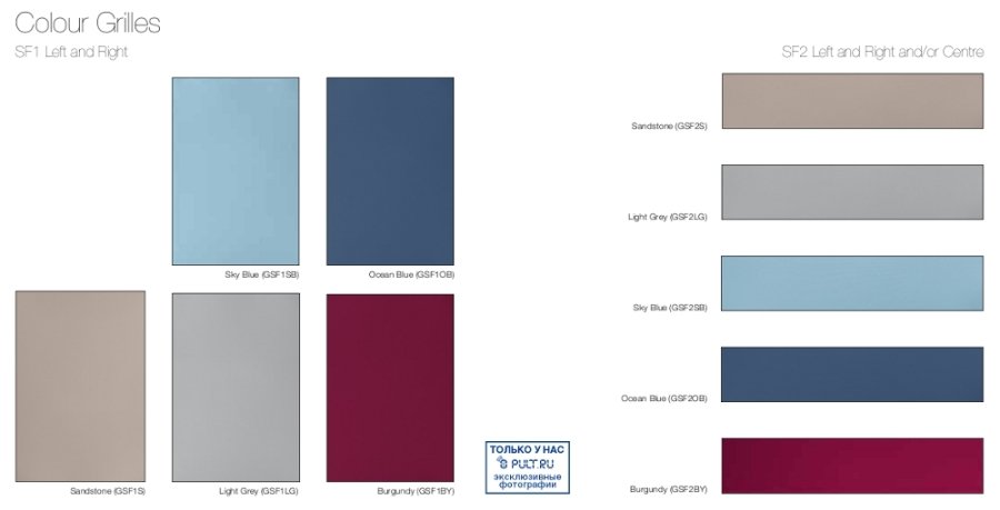 Возможно заказать одноцветный гриль (Sky Blue, Ocean Blue, Sand Stone, Light Gray, Burgundy), гриль с рисунком (Pebbles, Blue Drops, City, Pink Sunset, Red Drops, Red Sunset, Daisy, Beach, Green Flourish, Blue Motion, Red Abstract, Green Abstract, Black Flourish, Floral Abstract) или гриль с фотографией предоставленной клиентом (PDF, 300dpi, от 60ти дней)