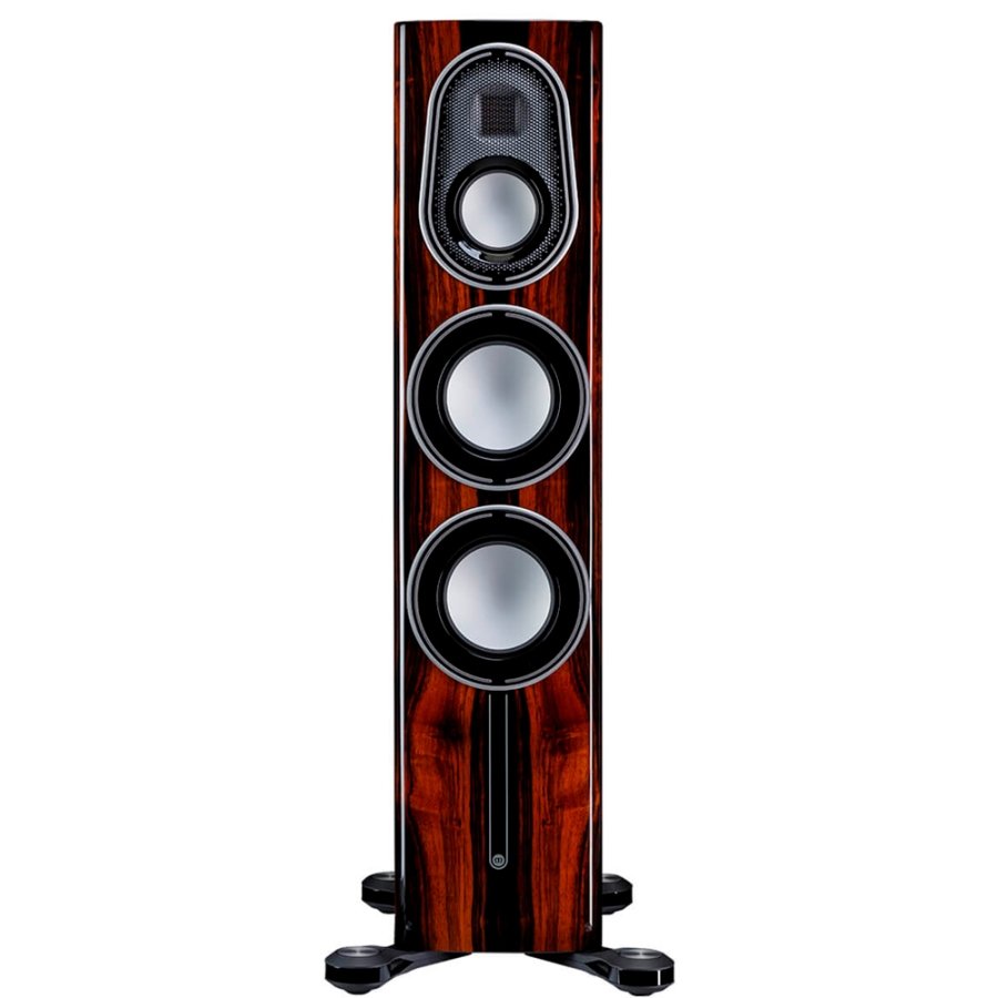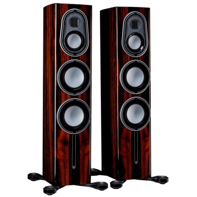 Напольные колонки Monitor Audio Platinum 200 3G входят в обновленную серию этой фирмы, модели в которой оснащены самыми передовыми технологиями, а также они построены на фирменных динамиках, использующих технологии RDT и MPD третьего поколения. Monitor Audio выбрали слоганом для новой линейки сочетание «Objects of Desire», что можно перевести как «Объект желания». И в самом деле, эти модели с первого взгляда разбудят страсти большинства аудиофилов. Micro Pleated Diaphragm III – это излучатель Хейла или Air Motion Transformer. Его преимущества – меньшая хрупкость, благодаря своего рода рёбрам жёсткости характерной «гармошки», и более высокая эффективность за счёт большей поверхности излучения при равных габаритах. В акустических системах такого уровня мелочей не бывает. На этапе разработки тщательно отбираются и тестируются все элементы, включая компоненты разделительных фильтров, на предмет их способности к перегрузкам и минимизации искажений. С позиции механической стабильности, решено было «убить сразу двух зайцев». Не только улучшить виброразвязку корпуса в целом, но и разместить в его опоре разделительный фильтр. Ведь микрофонный эффект никто не отменял! C-CAM – инновационный сплав, изначально разработанный для аэрокосмической отрасли. Диффузор из C-CAM обладает идеальными качествами, будучи чрезвычайно жёстким, но достаточно лёгким. Сплав алюминия и магния при производстве C-CAM подвергается процессу снятия внутренних напряжений, чтобы избежать деформации поверхности и понижения прочности. На поверхность наносится слой чистой керамики (корунд), диффузоры имеют высокую стойкость изгибу. После формовки материал С-САМ обеспечивает повышенную чёткость и сниженное искажение сигнала по сравнению с обычными диффузорами. Rigid Diaphragm Technology III – это диффузор в виде сэндвича, где на основание из сотового арамида Nomex снаружи наносится C-CAM (сплав алюминия и магния с керамическим покрытием), а внутри — два слоя углеволокна с перпендикулярно ориентированными волокнами. Также изменения внесены в кромку диффузора и конструкцию подвеса, в результате новые динамики обладают рекордно низкими искажениями за всю историю компании Monitor Audio. Изготовлен из панелей МДФ сложного профиля, образующих изогнутый усиленный жёсткий корпус толщиной 18-21 мм с перегородками толщиной 36 мм. Верхняя панель украшена гравированной вставкой. Финишная отделка – 16 слоёв лака. Вместо единой плиты теперь используются четыре массивных алюминиевых ножки на стальном основании. Казалось бы, элементарная деталь? Но только не в случае Monitor Audio! Здесь каждая ножка собрана из десятка элементов. Возможна индивидуальная регулировка высоты шипов или их демонтаж, если вы предпочитаете встроенные резиновые упоры.